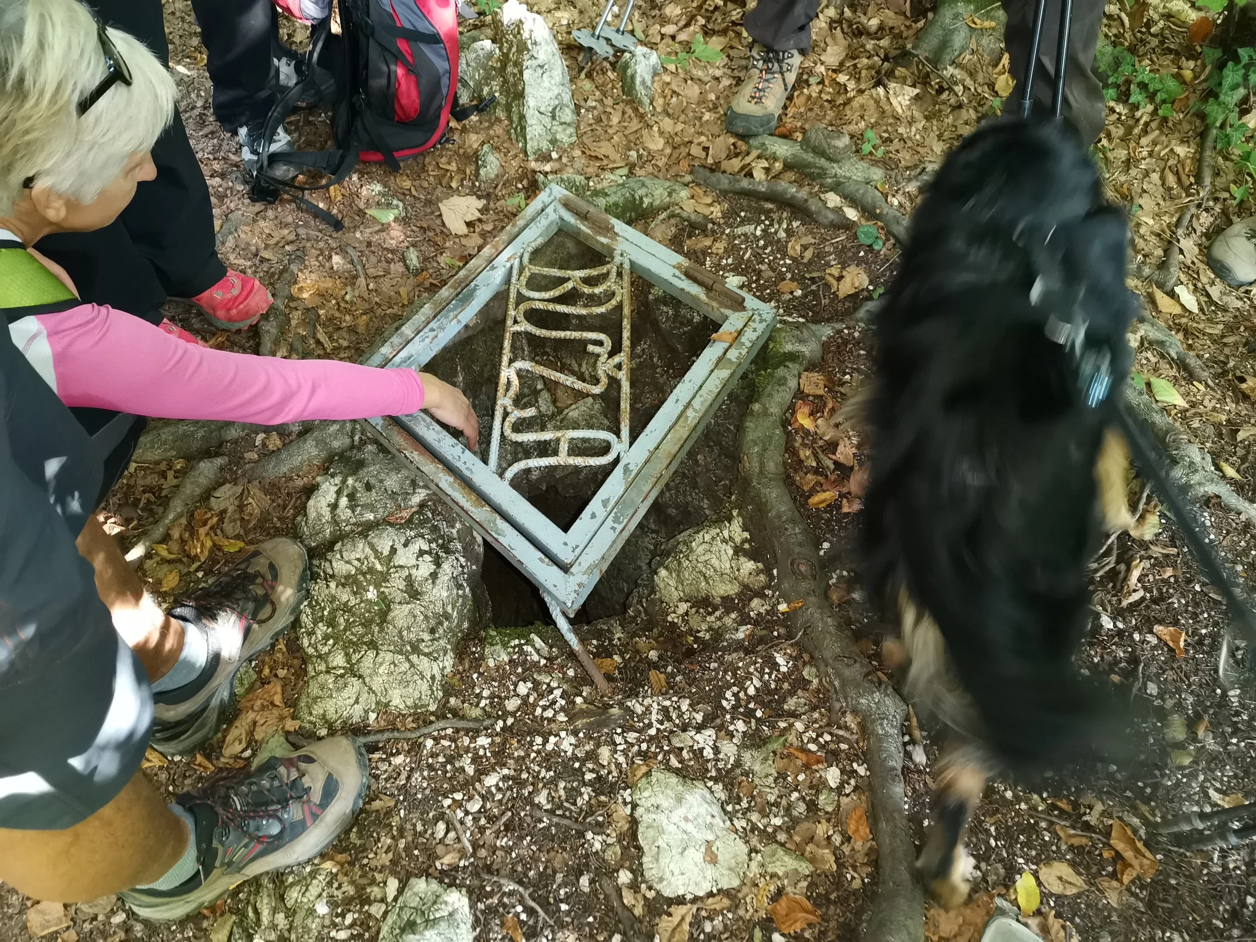 Starejši planinci lahko počakajo pri koči in se odpravijo na razgledni stolp. Mi pa nadaljujemo v spustu do jamskega dimnika Ferranove Buže 680m. ( Pazi, da ne padeš v jamo! )